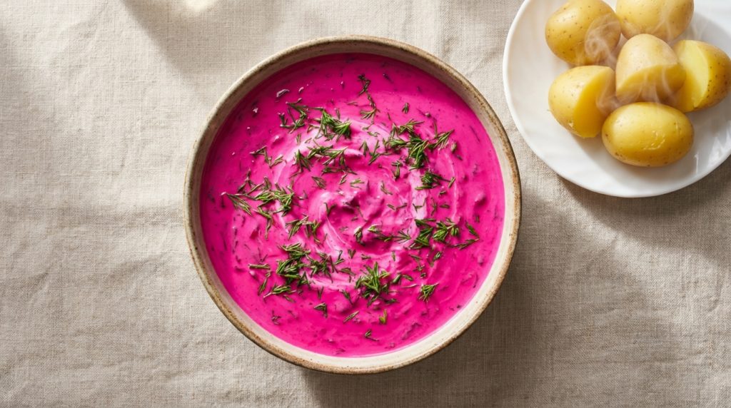 1. シャルティバルシチ (Šaltibarščiai) – 鮮烈なピンク色の「冷製ビーツスープ」