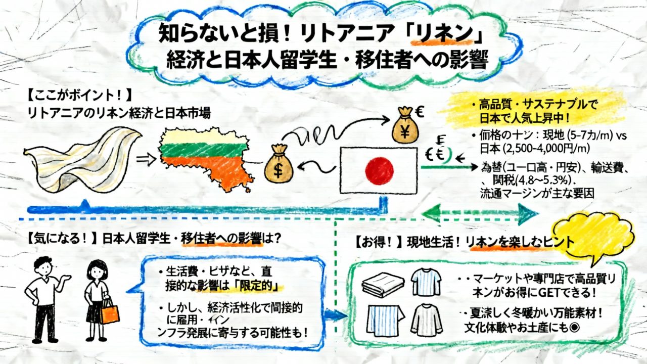 今回のリトアニアリネンの日本市場での動向に関するニュースは、直接的に日本人留学生やリトアニアに在住する方々の生活費、ビザ、治安、教育、交通、住居といった実生活に大きな影響を与えるものではありません。
