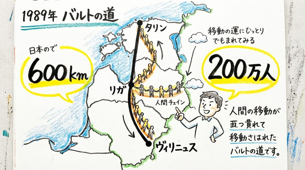 三国の市民は手と手をつなぎ、長大な列を作って「自由」と「独立」を訴えました。SNSも携帯電話もない時代に、ラジオと口コミだけでこれだけの動員を実現した事実は、彼らの結束の固さを物語っています。約600kmにわたり途切れることなく続いた人々の列は、物理的な鎖以上に強固な「意志の鎖」として国際社会に独立への渇望を知らしめました。