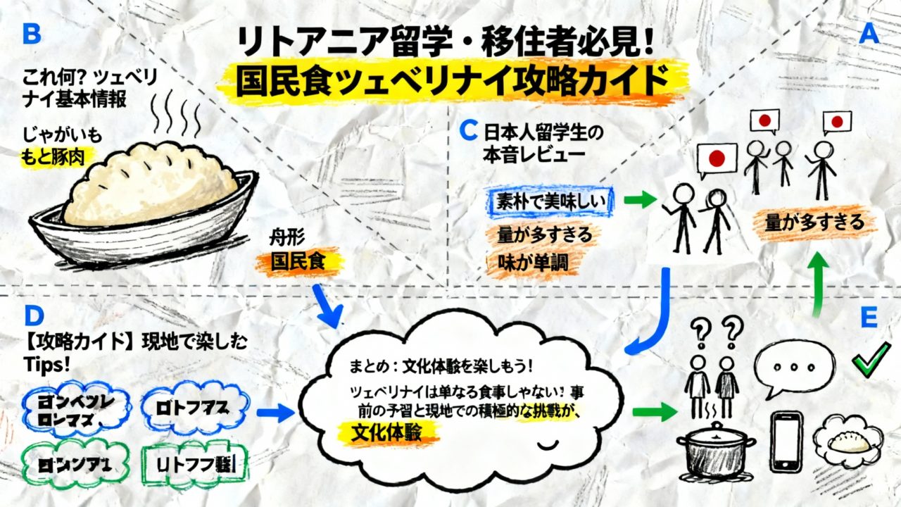 - 生活面: リトアニアの食文化を理解し、外食時の選択肢を広げる上で参考になります。量が多い場合はシェアするなど工夫が必要です。