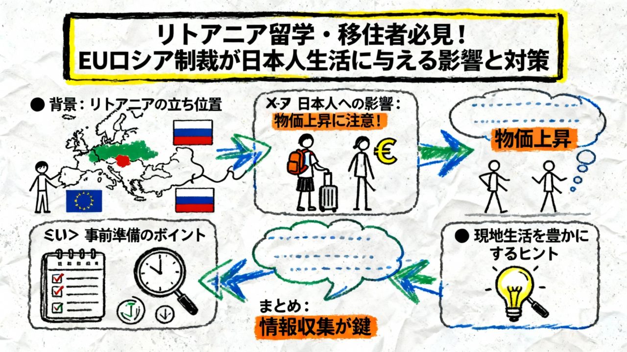 EUの対ロシア制裁は、リトアニアを含むEU全体の経済情勢に間接的な影響を与えていますが、日本人留学生や移住者の生活に直接的な支障をきたすものではありません。物価の変動やサプライチェーンの状況に注意を払いつつ、在リトアニア日本国大使館や現地の信頼できる情報源から最新情報を収集することが何よりも重要です。