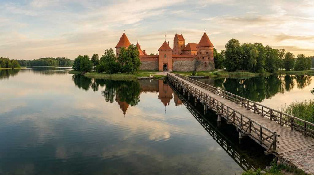 ヴィリニュスでの散策を楽しんだら、次は少し足を伸ばして、リトアニア観光のハイライトとも言える「トラカイ島城(Trakai Island Castle)」へ向かいましょう。首都ヴィリニュスからバスや鉄道でわずか30〜40分。日帰り旅行に最適なこの場所には、まるで絵本から飛び出したような幻想的な風景が広がっています。